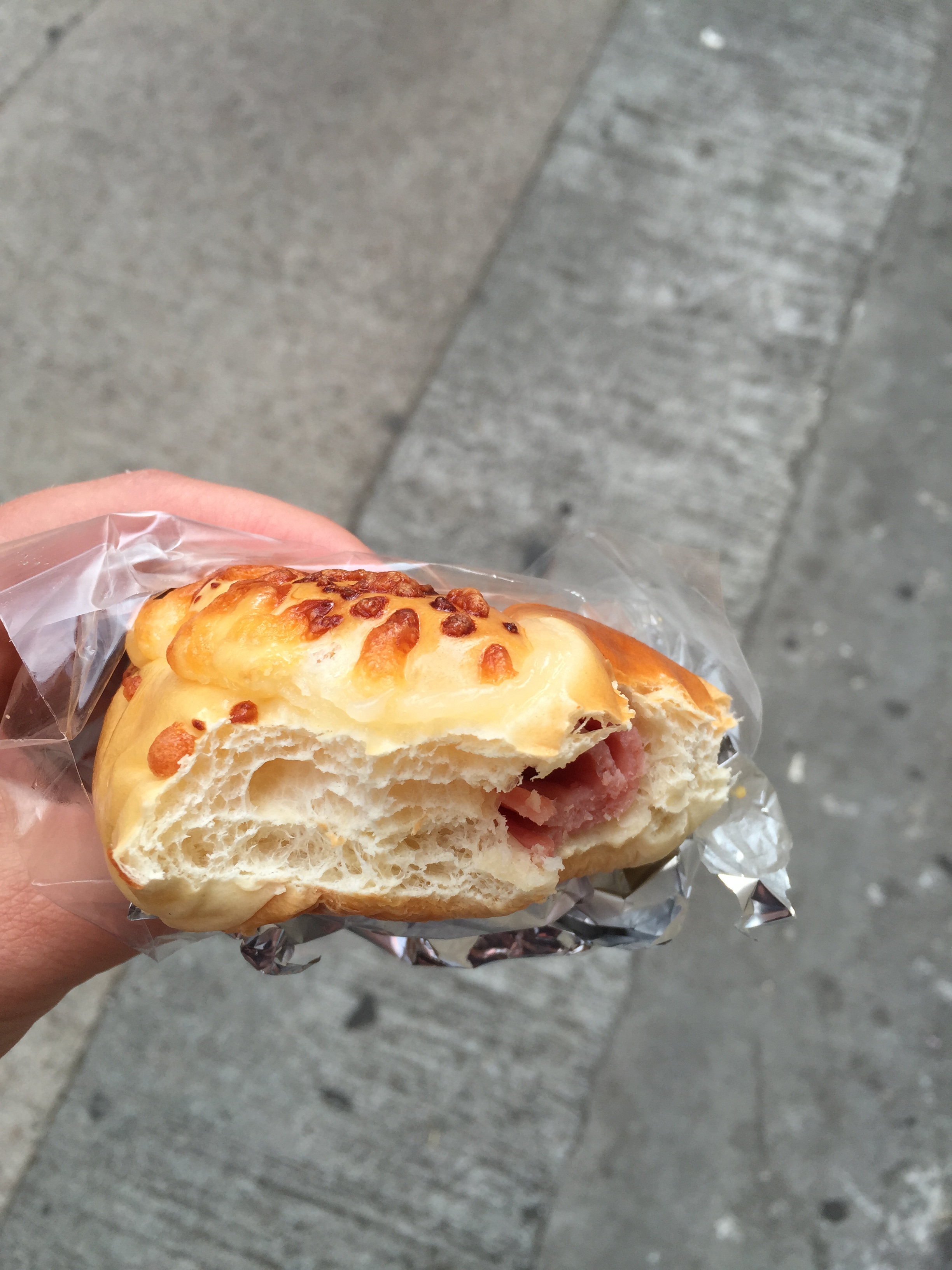 Yesterday morning I was looking for a quick bite of breakfast on the way to work that included some protein so I popped in to a little bakery (no idea what the name is) on my route to the office. They offer all kinds of interesting buns, like a pineapple bun, bean bun, pork bun, etc. I tried the meat and cheese bun and ate it as I walked to work. I really liked it, especially since it cost less than $1 CAD.  This is a very typical breakfast in Hong Kong from what I have seen.