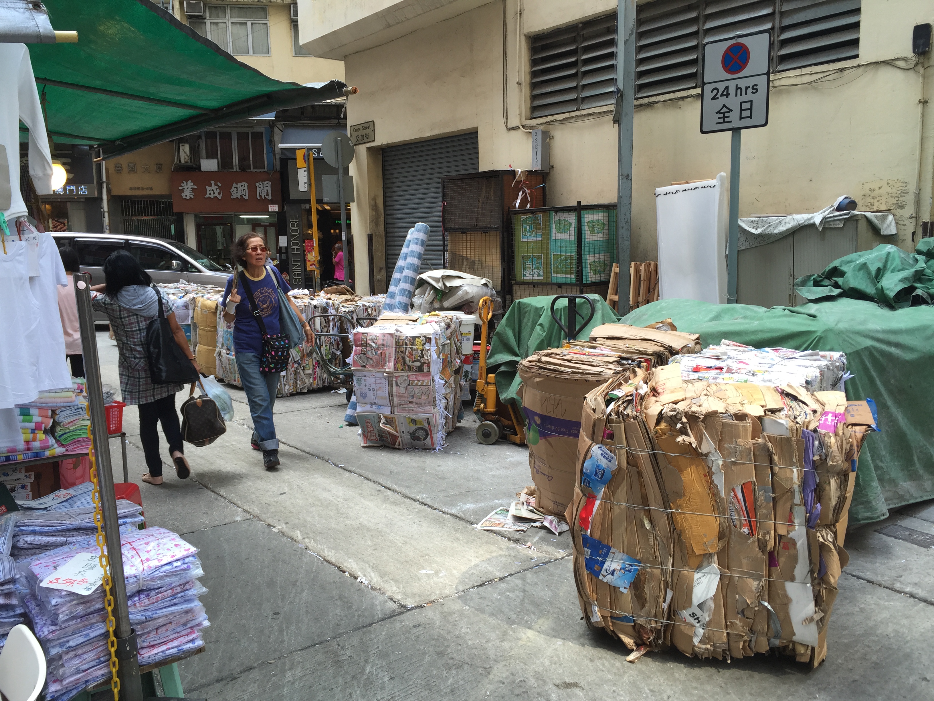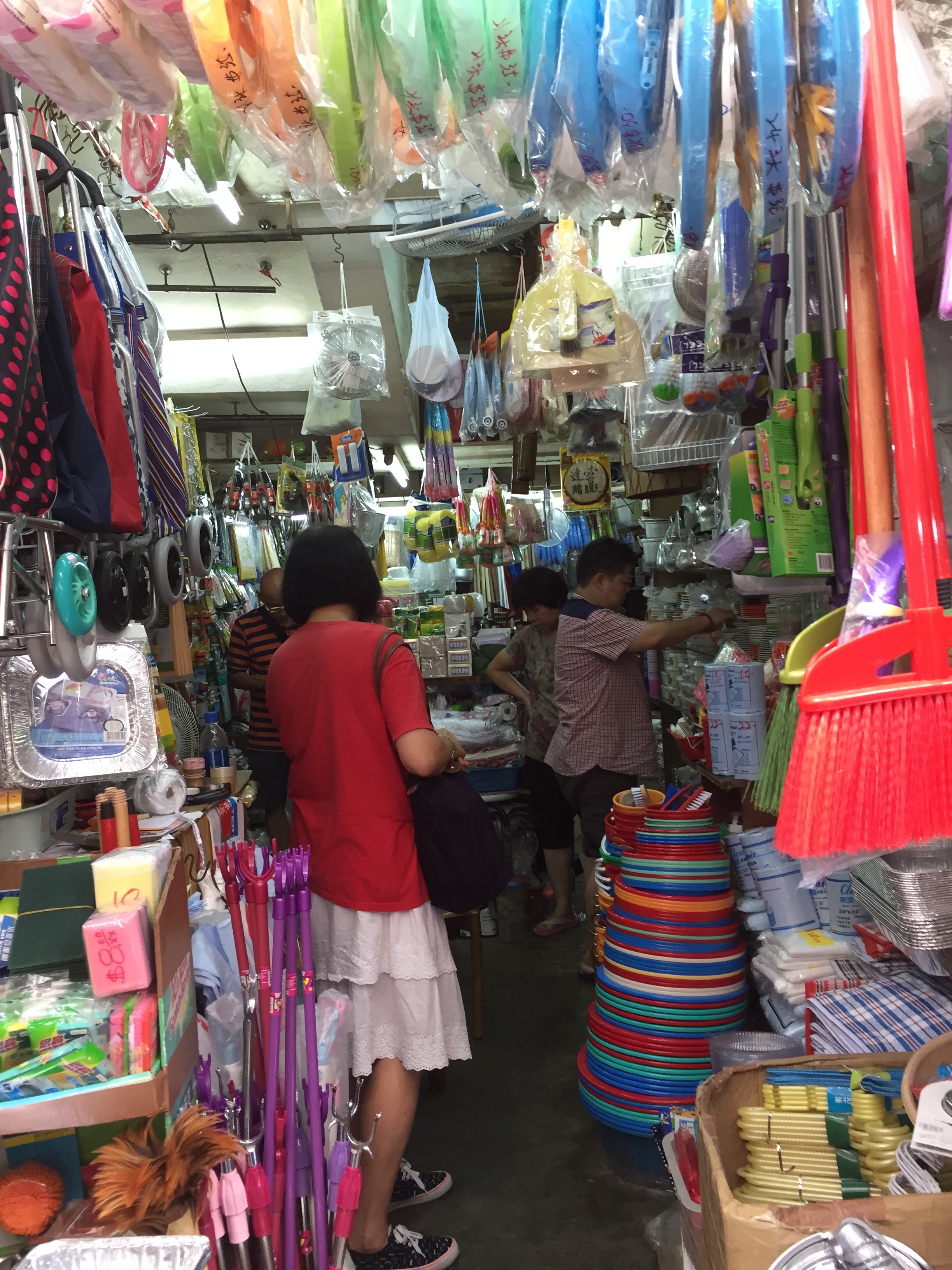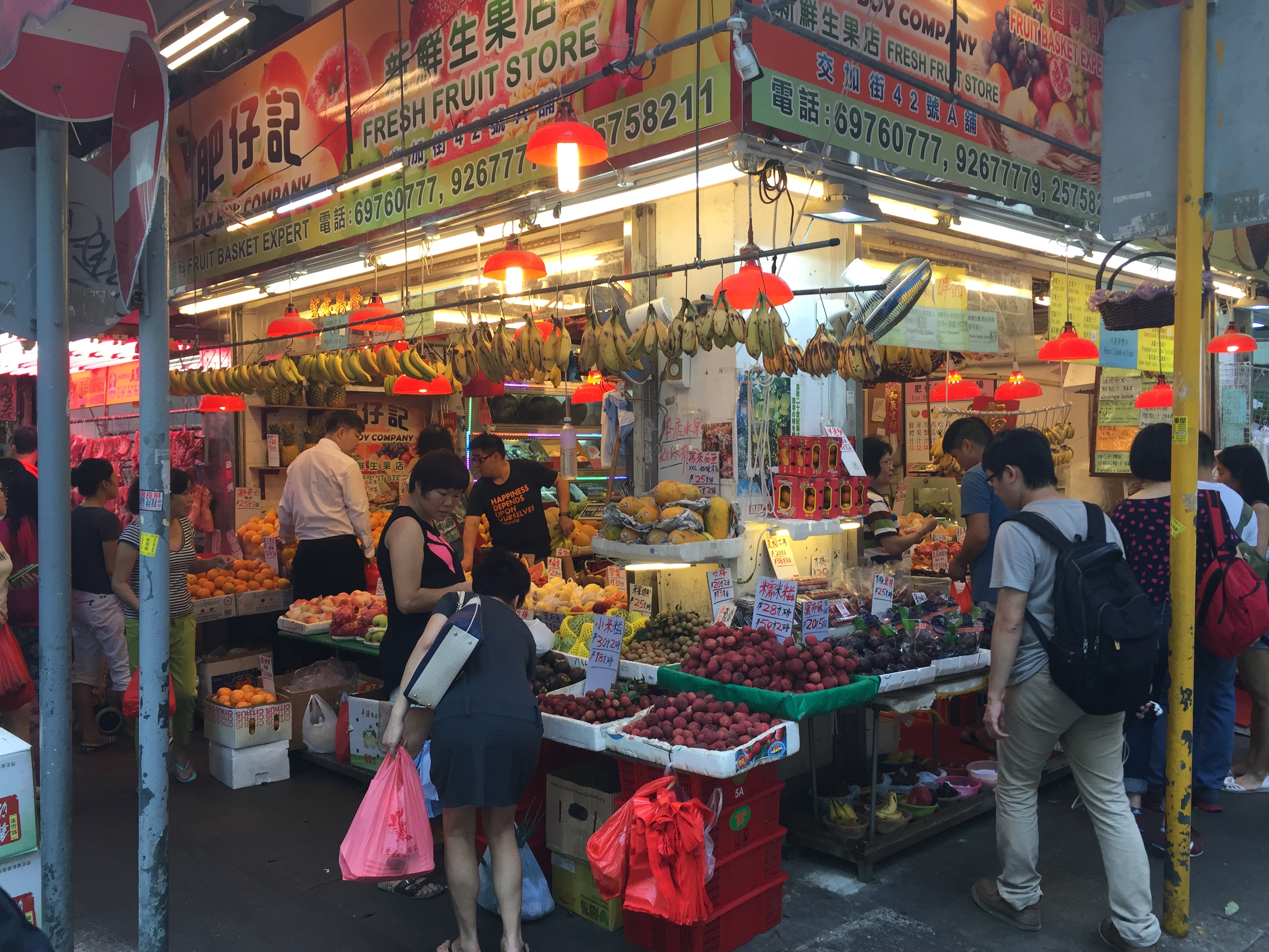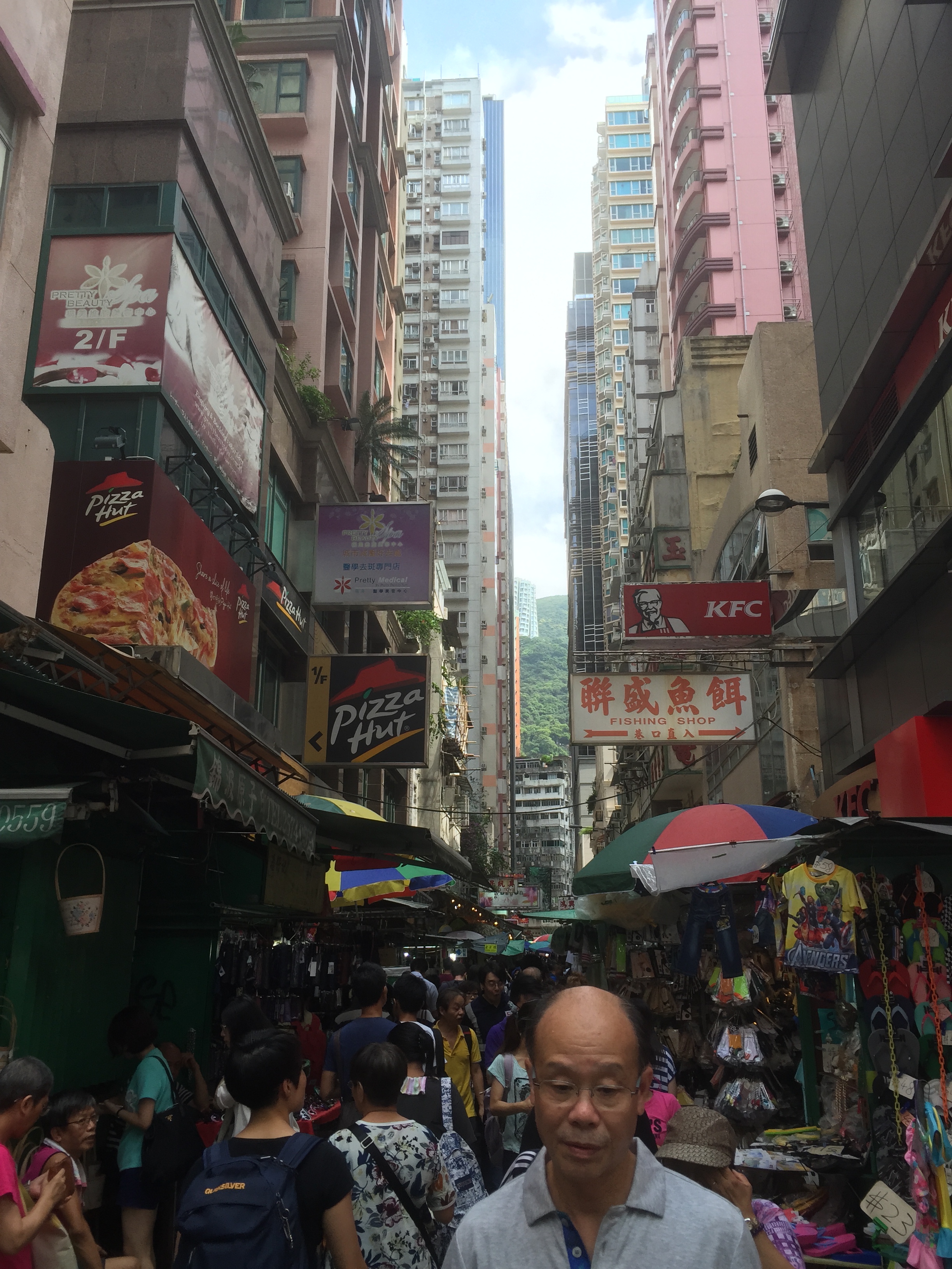 Starting the market experience on Tai Yeun Street.3 speed battery operated fans (level 3 is always necessary). Everyone carries them around when they walk outside and hold them up to their face / neck for relief from the heat.Most stalls and shops specialize in one thing. This one is for kid’s toys / inflatables.The streets are covered with tarps and umbrellas. Being tucked in between so many tall buildings it’s shady and you can barely see the sky.Typical little restaurant on the corner.The suspended red lights are very “market-iconic”; you see them in most of the shops, but not really anywhere else in Hong Kong.This is the stinkiest corner. The butcher shop smells so metallic and bloody, and the fish shop across the street smells so fishy, especially in this heat. I gag when I walk by.These ladies eat their little packed lunch while tending their stall of dried goods. I like their metal containersOh boy, this butcher shop is something else. I don’t understand how the meat can sit out in the open air like this when it’s so hot.All the dried fish products you could ever need.I love the fruit stands. Everything looks so colourful and bright.These guys are obviously hot – no shirts under their aprons at this stall. You can see the typical chopping block under his knife – they are worn down to a concave shape.One of the many market alleyways.Basically the Hong Kong version of a dollar store. Anything and everything is sold here – lots of plastic junk.There are a couple restaurants along the street too. This one sells roast duck, chicken etc.This lady was purchasing half a duck to take home (I think).Not the type of Supermarket I’m used to!I also like the veggie shops. Everything looks really fresh.Another fruit stand, basically an alleyway covered in tarps.Seafood shop with lots of live offerings.Difficult to see in this photo, but the bins under the rack were filled with live eels.Egg stall (again, not sure how these can sit out in the heat all day?) or what those dark things are in the photo foreground. Typical shop keeper, playing a game on his cell phone.Stalls, signs and very little sky.Traditional Chinese stuff (?) stall. Lots of little trinkets here!Cardboard recycling station.I made my exit from the market down Spring Garden Lane.