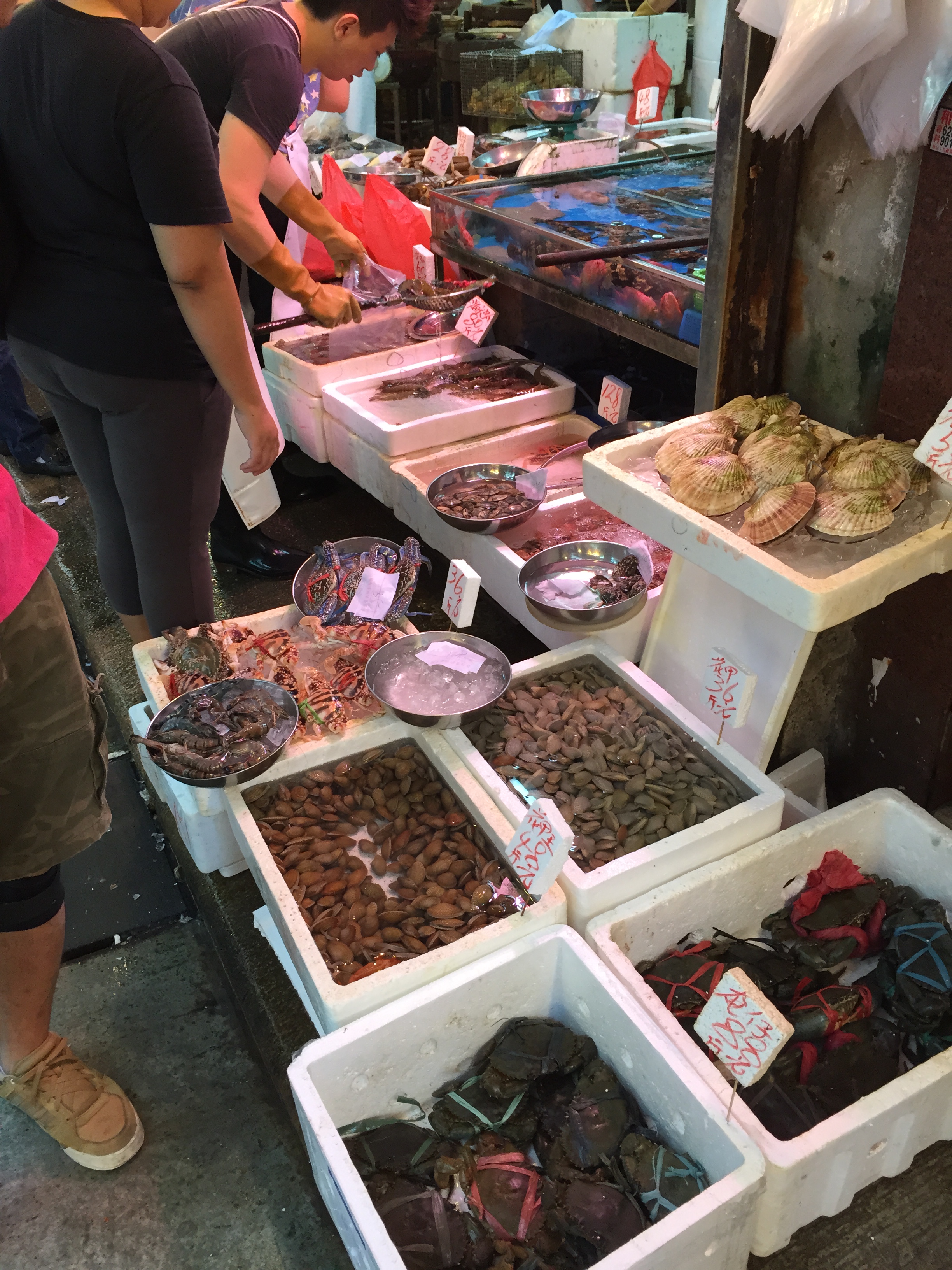 A couple blocks from where we live is the Wan Chai Market, an indoor area filled with stalls selling vegetables, fruit, fish, meat, etc. This type of market is known as a wet market, because it sells fruits, veggies, meat, etc. opposed to textiles, electronics, etc. The surrounding streets are also filled with stalls selling all sorts of wares. See below for a photo tour of the Wan Chai Market.
