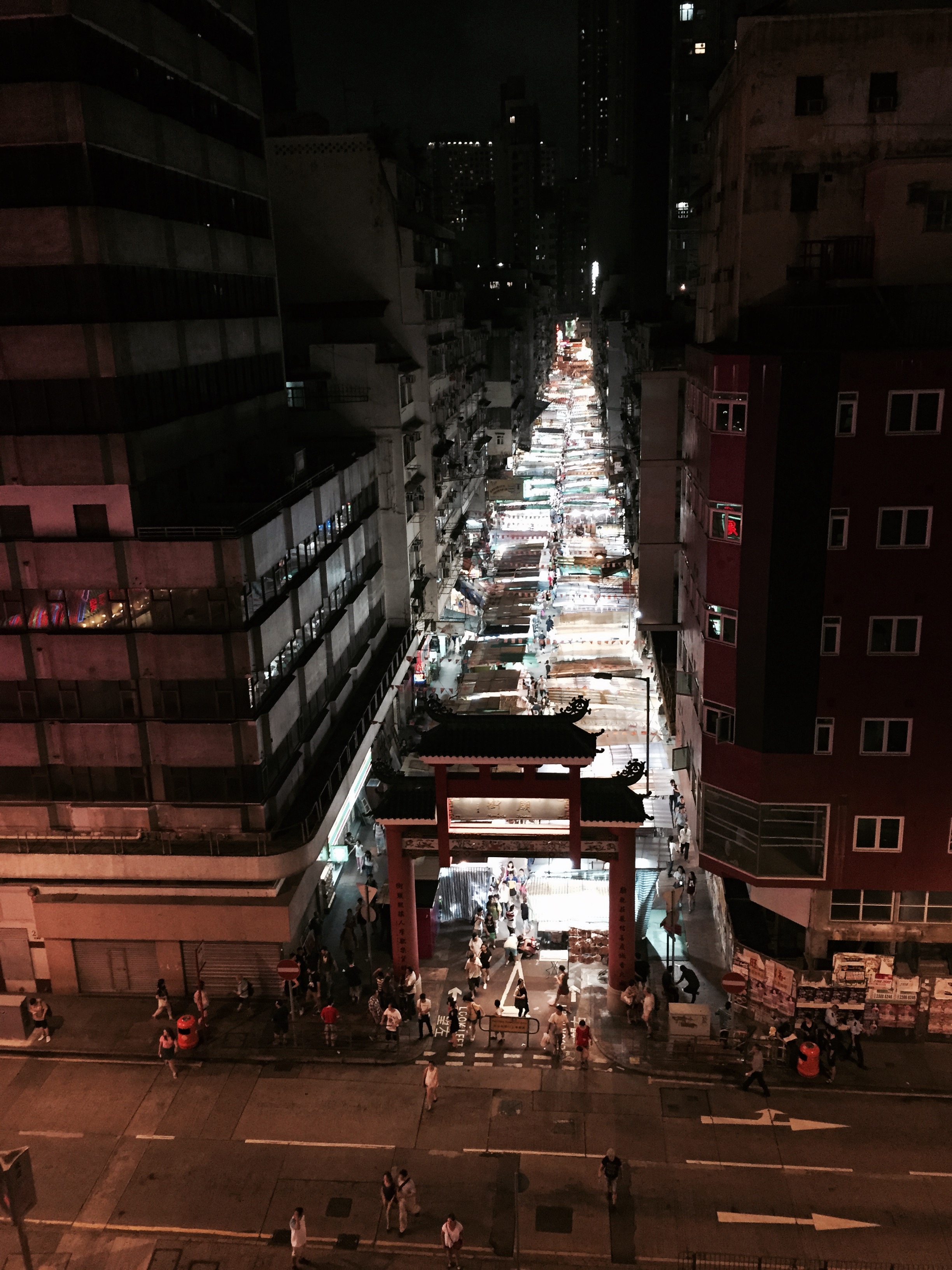 A block after Psychic Street we got to the Temple Street Night Market. Seriously, so many markets. We got to the entry area and Braden looked back and noticed the parking structure (which, incidentally, had a major freeway running through it) behind us. We walked up to capture a bird’s eye view of the market. It seemed to stretch on forever and was so colourfully lit up.