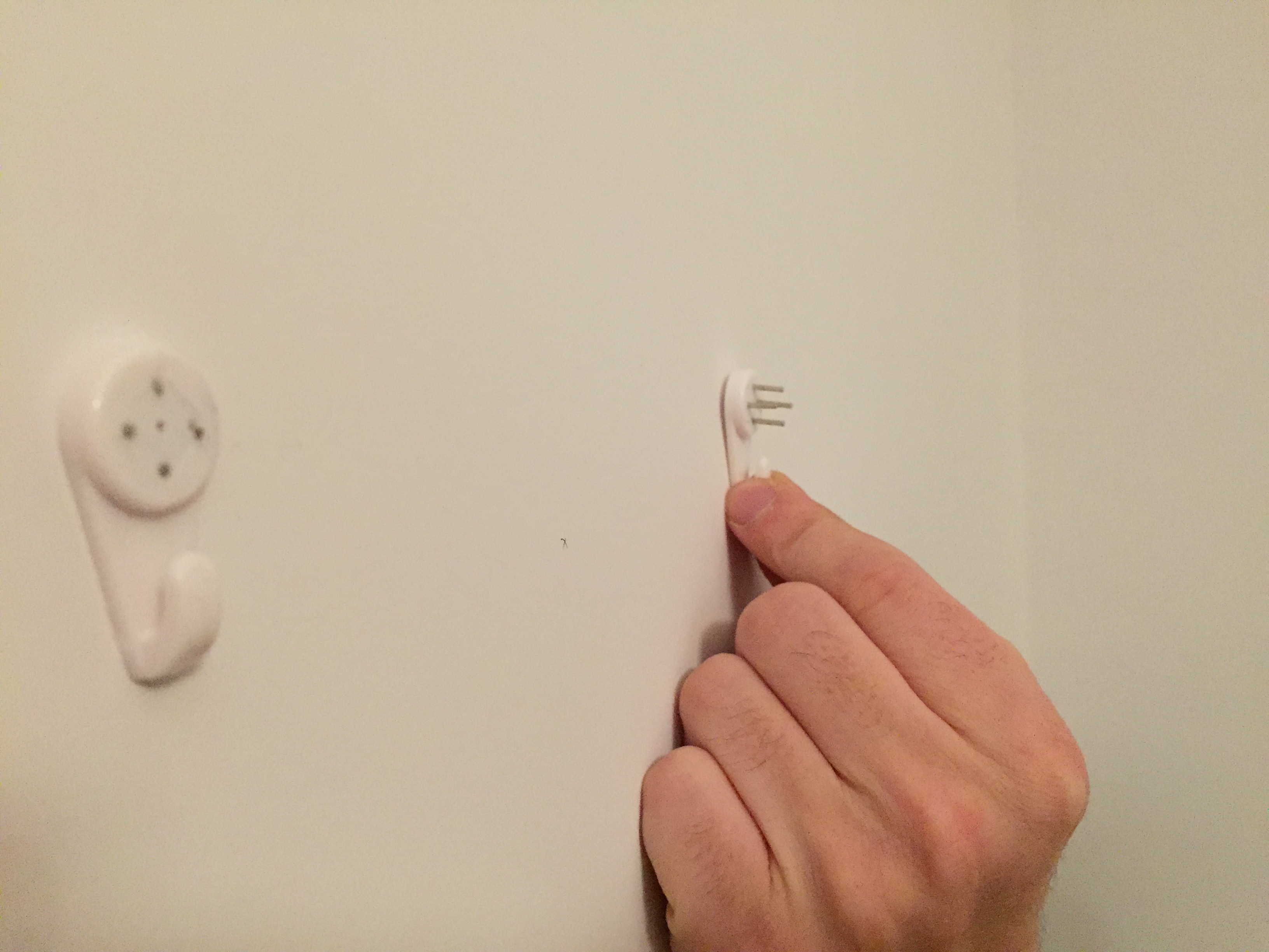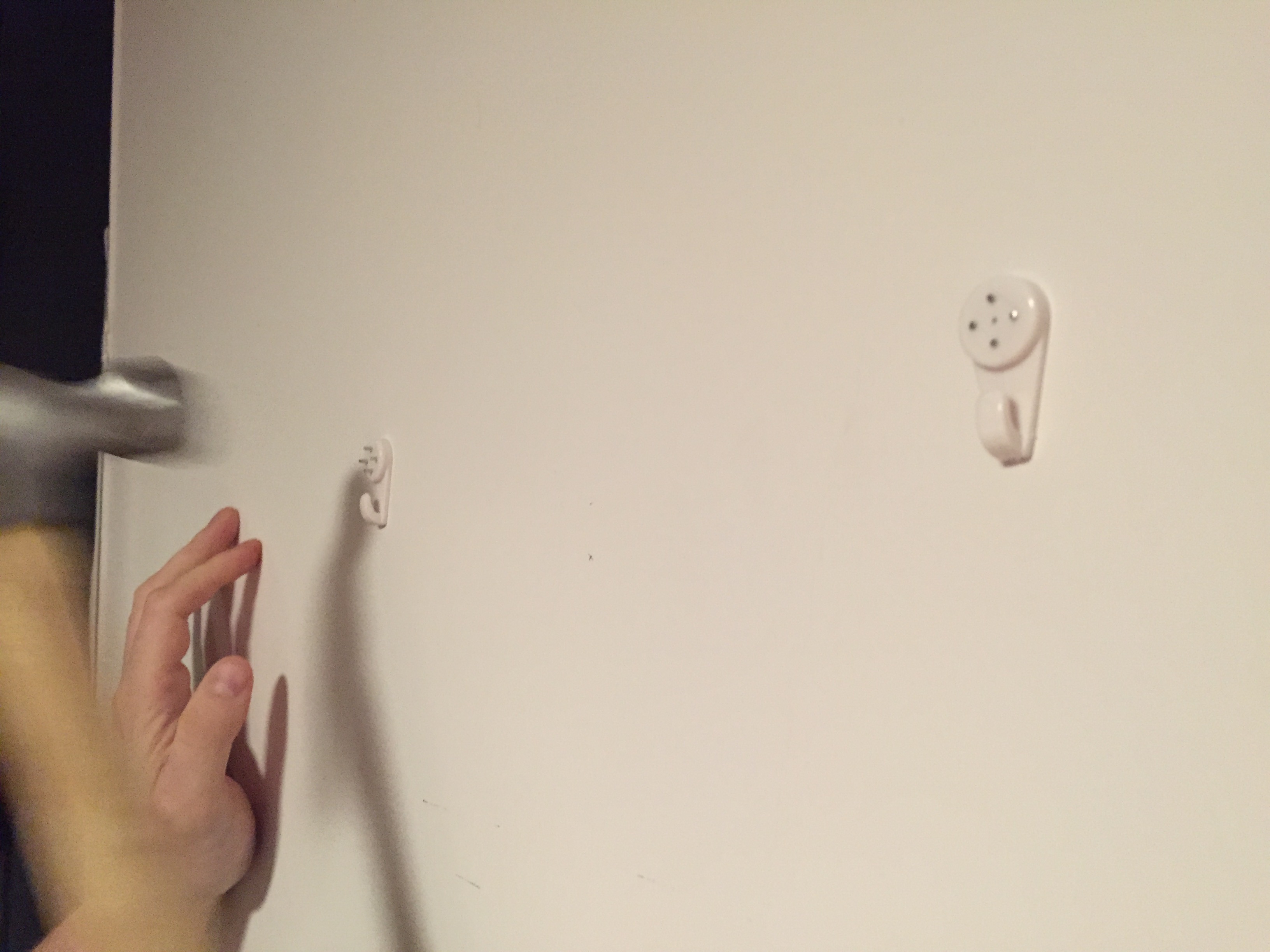 It took us some time to get that task done because we weren’t certain how to hang in to concrete without damaging the walls and risking our damage deposit. I found some great little concrete-specific hangers at the grocery store – problem solved!